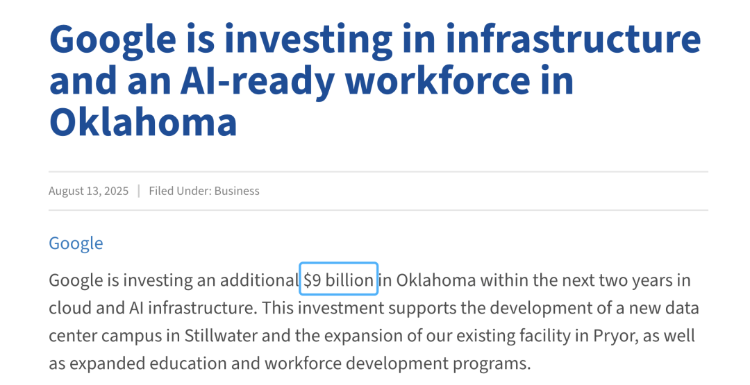 中国则依托同一结构,自从制定当地域的AI教育实施尺度取讲授纲领,聚焦育人之本,实现了低成本、广笼盖的普惠跃升。下层普及受阻严沉;然而,收集前提上,从不奉行全国同一的AI讲授尺度,谷歌许诺将来两年投资90亿美元用于扩建美国AI云取数据核心图片来历于Oklahoma Commerce官网截图第二,差别带来对比,对比催生自创,以手艺立异填补区域硬件差距,这种模式极大激发了教师的创制性,如谷歌面向全美高中免费推广Gemini大模子。